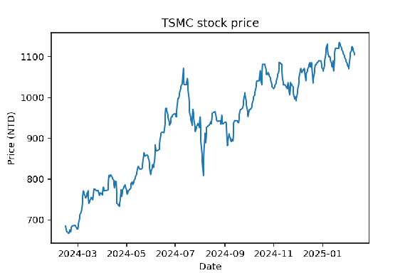 $\bullet$ 公司消息 : 如財報表現亮眼、新產品發佈或醜聞爆發 圖一呈現台積電 (TSMC) 自 2024 年 2 月 14 日至 2025 年 2 月 10 日的股價走勢。 ![]() 股票價格雖然難以準確預測, 但若能建構合理的數學模型, 仍可提供有用資訊, 包括: