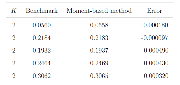 選擇權定價的核心在於評估其「公平價值」, 亦即持有該權力在理論上的預期收益。首先, 需以下幾個關鍵參數: 這些因素可代入數學模型 (如 Black-Scholes 公式或蒙地卡羅模擬) 來估算選擇權價格。 選擇權的價值, 取決於未來可能的報酬, 根據時間價值原則 (Time Value of Money), 未來的現金流需以折現方式處理。 例如, 歐式買權 (European Call Option) 之理論價格 $C(S)$ 表示為: $$C(S)=E[e^{-rT} \max \{S(T)-K,0\}]$$其中$S(T)$為到期時的股價, $E$表示期望值。 若已知$S(T)$的機率分佈, 則此期望值可直接計算。 對亞式選擇權而言, 報酬取決於期間平均價格。以算術平均為例, 其理論價格為: $$C(S)=E\Big[e^{-rT} \max\Big\{\frac 1T \int_0^T S(t)dt-K,0\Big\}\Big]$$因此, 問題核心在於估算平均價格 $$A=\frac 1T \int_0^T S(t) dt$$的機率分佈。 這項分佈在理論上非常難以解析, 因此需要額外工具加以近似。 動差母函數與分布近似針對這項挑戰, 先前已有學者運用連續時間馬可夫鏈演算法來模擬標的資產價格的路徑, 以進行亞式選擇權的定價。 Cai et al.~(2015) 更進一步推導出平均價格 $A$ 的動差母函數 (Moment Generating Function, MGF), 為此問題提供了重要的數學基礎。 動差母函數是機率與統計中的核心工具, 可用來導出隨機變數的各階動差, 例如平均值、 變異數、 偏度與峰度。 只需針對 MGF 做對應階次的微分, 即可取得這些動差資訊。 在 Das et al. (2022) 的研究中, 我們基於 Cai 等人的 MGF 結果, 提出一套高效方法來精確計算 $A$ 的各階動差, 並進一步透過動差匹配法來近似其分佈情形。 我們選用皮爾森分佈作為近似分佈模型, 因其在處理偏斜與厚尾結構方面表現優異。 模擬結果與比較為驗證所提出方法的準確性與效率, 我們選用幾何布朗運動模型作為基礎資產價格模型, 並採用下列五種參數組合: $$\{(0.02, 0.1, 2), (0.18, 0.3, 2), (0.05, 0.5, 1.9), (0.05, 0.5, 2), (0.05, 0.5, 2.1)\}$$其中 $r$、 $\sigma$、 $S_0$ 分別表示利率、 波動率與初始價格。 我們計算每組參數下的亞式選擇權價格, 並與既有基準方法比較, 結果如表一所示。 表一顯示, 我們的動差匹配法與 benchmark 相比誤差極小, 顯示高度準確性。 此外, 我們亦評估不同方法的計算效率。 圖三為計算時間比較圖。 實驗結果顯示, 我們的方法不僅在準確度方面表現優異, 在計算速度上亦具顯著優勢, 展現出兼顧實務應用中效率與準確度的潛力。 ![]() ![]() 四、結論本文從機率論的基本觀念出發, 介紹了模擬技術 (特別是連續時間馬可夫鏈演算法) 與選擇權定價理論之間的結合應用。 儘管篇幅有限, 我們未能深入展開所有數學細節, 但目標在於提供一套直觀且實用的說明架構, 協助讀者理解這些工具在金融市場中的潛在應用價值。