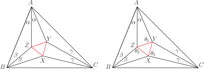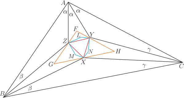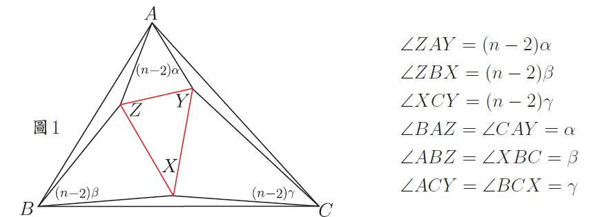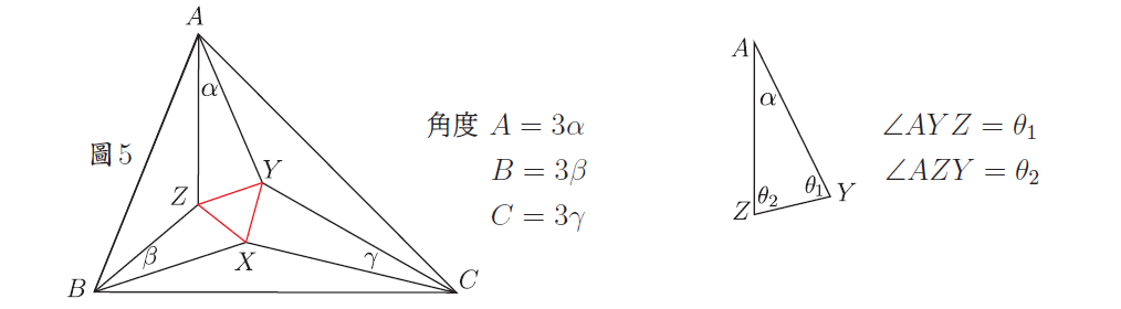 --深化統合Morley角三分線定理 (Morley's theorem)-- 壹、前言平面幾何中以尺規作圖法對任一角度作 $n$ 等分角被證明是不盡然可行的; 但若放寬尺規作圖的限制, 或允許使用另外的工具, 那麼 $n$ 等分任意角仍舊是可能的; 意即平面上任何角度的 $n$ 等分線於理論上是存在的, $n$ 為正整數。 首先, 請檢視下列的多倍角三角恆等式轉化成數值連乘積形式; (i) 2 倍角: $\sin 2\theta =2\sin \theta \cdot \cos \theta =2\sin \theta \cdot \sin \Big(\dfrac \pi 2+\theta \Big)$。 (ii) 3 倍角: \begin{align*} \sin 3\theta =\,&3\sin \theta -4\sin^3 \theta =\sin \theta \cdot (3-4\sin^2 \theta )\\ =\,&\sin \theta \cdot (3\cos^2 \theta -\sin^2 \theta )\\ =\,&\sin \theta \cdot (\sqrt{3} \cos \theta +\sin \theta)\cdot (\sqrt{3} \cos \theta -\sin \theta )\\ =\,&4\sin \theta \cdot \sin \Big(\dfrac \pi 3+\theta \Big)\cdot \sin \Big(\dfrac {2\pi}3+\theta \Big). \end{align*}(iii) 4 倍角: \begin{align*} \sin 4\theta =\,&2\sin 2\theta \cdot \cos 2\theta =4\sin \theta \cdot \cos \theta \cdot (\cos^2 \theta -\sin^2 \theta )\\ =\,&4\sin \theta \cdot \cos \theta \cdot (\cos \theta +\sin \theta )\cdot (\cos \theta -\sin \theta )\\ =\,&8\sin \theta \cdot \sin \Big(\dfrac \pi 2+\theta \Big)\cdot \sin \Big(\dfrac \pi 4+\theta \Big)\cdot \sin \Big(\dfrac{3\pi}4+\theta \Big)\\ =\,&8\sin \theta \cdot \sin \Big(\dfrac \pi 4+\theta \Big)\cdot \sin \Big(\dfrac{2\pi}4+\theta \Big)\cdot \sin \Big(\dfrac{3\pi}4+\theta \Big). \end{align*}(iv) 5 倍角: \begin{align*} \sin 5\theta =\,&5\cos^4 \theta \cdot \sin \theta -10\cos^2 \theta \cdot\sin^3 \theta +\sin ^5 \theta\\ =\,&\sin \theta \cdot (5\cos^4 \theta -10\cos^2 \theta \cdot\sin^2 \theta +\sin ^4 \theta )\\ =\,&\sin \theta \cdot [(25\cos^4 \theta -10\cos^2 \theta \cdot\sin^2 \theta +\sin ^4 \theta )-20\cos^4 \theta ]\\ =\,&\sin \theta \cdot [(5\cos^2 \theta -\sin^2 \theta )^2-(2\sqrt{5}\cdot\cos^2 \theta )^2 ]\\ =\,&\sin \theta \cdot [(5-2\sqrt{5})\cos^2 \theta -\sin^2 \theta ]\cdot [(5+2\sqrt{5})\cos^2 \theta -\sin^2 \theta ]\\ =\,&\sin \theta \cdot \Big(\sqrt{5-2\sqrt{5}}\cos \theta +\sin \theta \Big)\Big(\sqrt{5-2\sqrt{5}} \cos \theta -\sin \theta \Big)\\ &\,\cdot \Big(\sqrt{5+2\sqrt{5}}\cos \theta +\sin \theta \Big)\Big(\sqrt{5+2\sqrt{5}} \cos \theta -\sin \theta \Big)\\ =\,&16\sin \theta \cdot \sin \Big(\dfrac \pi 5+\theta \Big)\cdot \sin \Big(\dfrac{2\pi}5+\theta \Big) \cdot \sin \Big(\dfrac{3\pi}5+\theta \Big)\cdot \sin \Big(\dfrac{4\pi}5+\theta\Big). \end{align*}因 $\sin\dfrac{\pi}5=\dfrac{\sqrt{10\!-\!2\sqrt{5}}}4 $, $\cos \dfrac{\pi}5=\dfrac{\sqrt{5}\!+\!1}4 $, $\sin \dfrac{2\pi}5=\dfrac{\sqrt{10\!+\!2\sqrt{5}}}4 $, $\cos \dfrac {2\pi}5=\dfrac{\sqrt{5}\!-\!1}4$。 持續應用 De Moivre's theorem 對 $6\theta$、 $7\theta $、 $8\theta$、$\cdots $、$n\theta$ 作正弦型演算, 可得。 (v) $n$ 倍角: $\sin (n\theta )=2^{n-1}\cdot \prod\limits_{j=0}^{n-1}\sin\Big(\dfrac{j\pi}n+\theta \Big)$。 $n$ 為正整數。 這 $\sin (n\theta )$ 的展開公式敬請參閱 Mathematica、 Wolfram Mathworld 或 Wikipedia 資料。 引述這 $n$ 倍角的 $\sin (n\theta )=2^{n-1}\cdot \prod\limits_{j=0}^{n-1}\sin\Big(\dfrac{j\pi}n+\theta \Big)$ 正弦數值連乘積公式對本文標題角度 $n$ 等分線性質的探討運算會啟動很高效益的應用推理演繹作用。 貳、本文特意要應用 $n$ 倍角正弦數值連乘積公式 $\sin (n\theta )=2^{n-1}\cdot \prod\limits_{j=0}^{n-1}\sin \Big(\dfrac{j\pi}n+\theta \Big)$, 主文將詳細分析並推演出三角形各內角的 $n$ 等分線類型各交點性質, 而後再利用這 $n$ 等分線交點性質逐一推論出三角形各內角的三等分線、 四等分線、 五等分線、$\cdots$ 等同類型各交點性質。 所有的思維與運算過程盡在主題敘述內容中。 一、三角形各內角的 $n$ 等分線性質主要命題: 任意給定一個 $\triangle ABC$, 示意圖 1, 頂角 $\angle CAB$ 角度設為 $A$, $A$ 角度的 $n$ 等分線有 $\overline{AZ}$、 $\overline{AY}$; 頂角 $\angle ABC$ 角度設為 $B$, $B$ 角度的 $n$ 等分線有 $\overline{BX}$、 $\overline{BZ}$; 頂角 $\angle BCA$ 角度設為 $C$, $C$ 角度的 $n$ 等分線有 $\overline{CY}$、 $\overline{CX}$, 臨近 $\triangle ABC$ 同一邊的兩道 $n$ 等分線各相交於點 $X$、 $Y$、 $Z$, 形成一個內部的 $\triangle XYZ$ 如圖示。 求證: $\triangle XYZ$ 的各內角角度為何及其性質 ? ![]() 證明: 圖 1 的 $\triangle ABC$, 角度 $A=n\alpha $, $B=n\beta $, $C=n\gamma $, 則 $\alpha +\beta +\gamma =\dfrac \pi n$。 由參考 $n$ 倍角的數值連乘積公式可得知 $\sin (n\theta )=2^{n-1}\cdot \prod\limits_{j=0}^{n-1}\sin\Big(\dfrac{j\pi}n +\theta \Big)$, (i) 在 $\triangle ABZ$ 中, $\angle AZB=\pi -\alpha -\beta =\dfrac{(n-1)\pi}n+\gamma $, 應用三角形正弦定理, 得 $\dfrac{\overline{AZ}}{\sin \beta}=\dfrac{\overline{AB}}{\sin \Big(\dfrac{(n-1)\pi}n + \gamma \Big)}$, 得線段 $\overline{AZ}=\dfrac{\overline{AB} \cdot \sin \beta}{\sin \Big(\dfrac{(n-1)\pi}n + \gamma \Big)}$, 同理在 $\triangle AYC$ 中, 可得線段 $\overline{AY}=\dfrac{\overline{AC}\cdot \sin \gamma}{\sin \Big(\dfrac{(n-1)\pi}n + \beta \Big)}$。 另在 $\triangle ABC$ 中, 線段關係式 $\overline{AB}\cdot \sin n\beta =\overline{AC}\cdot \sin n\gamma $, 得 $\dfrac{\overline{AB}}{\overline{AC}}=\dfrac{\sin n\gamma}{\sin n\beta}$。 (ii) 由 \begin{align} \dfrac{\overline{AZ}}{\overline{AY}} =&\dfrac{\overline{AB}}{\overline{AC}}\cdot \dfrac{\sin \beta \cdot \sin \Big(\dfrac{(n-1)\pi}n + \beta \Big)}{\sin \gamma \cdot \sin \Big(\dfrac{(n-1)\pi}n + \gamma \Big)}=\dfrac{\sin n\gamma }{\sin n\beta} \cdot \dfrac{\sin \beta\cdot\sin \Big(\dfrac{(n-1)\pi}n + \beta \Big)}{\sin \gamma\cdot \sin \Big(\dfrac{(n-1)\pi}n+\gamma\Big)}\nonumber\\ =&\dfrac{2^{n-1}\cdot \prod_{j=0}^{n-1}\sin\Big(\dfrac{j\pi}n+\gamma \Big)}{2^{n-1}\cdot \prod_{j=0}^{n-1}\sin\Big(\dfrac{j\pi}n+\beta \Big)}\cdot \dfrac{\sin \beta\cdot\sin \Big(\