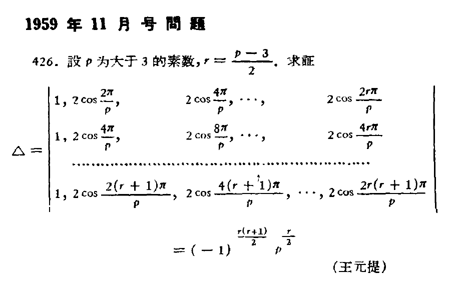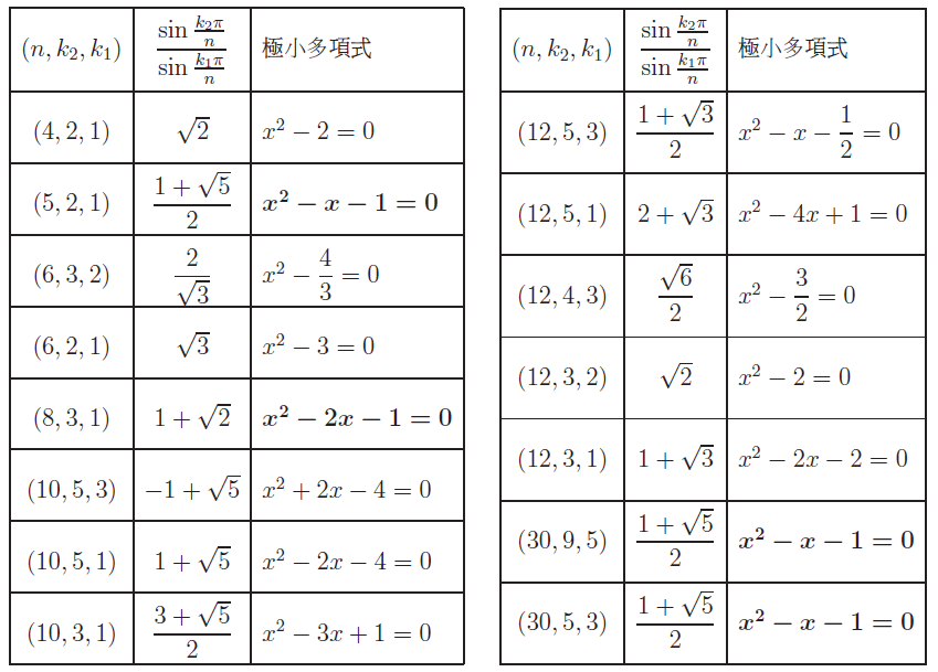 一、前言數論有悠久的歷史。 在西元前 300 年左右, 古希臘數學家歐幾里得編纂《幾何原本》十三卷, 其中涉及數論的有四卷, 分別是第七、八、九、十卷。 在第七卷有求兩個正整數最大公因數的歐幾里得演算法、 還有關於質數整除性質的歐幾里得定理 (若 $p\mid ab$, 則 $p\mid a$ 或 $p\mid b$), 第九卷有質數無窮的敘述與證明, 第十卷(全書最重要的部分)則有 $\sqrt{2}$ 是無理數的證明。 參見 Kline 的《古今數學思想》 無理數的發現(通常歸功於畢達哥拉斯學派), 在整個數學史上都是光輝的一頁。 我們的故事也是從 $\sqrt{2}$ 的無理性引出的。 事實上, 古希臘人對 $\sqrt{2}$ 是無理數的表述, 是用幾何語言。 歐幾里得如是說: 「正方形的對角線與邊長不可公度」。 (所謂兩個量可以公度, 就是說其比值可以表示為兩個正整數之比。 歐幾里得證明了更一般的結論, 若 $n$ 不是完全平方數, 則 $\sqrt{n}$ 不可公度。) 它等價於下述關於 Diophantine 方程的結果: $a^2=2b^2$ 沒有正整數解。 在這個形式下, 考慮奇偶性, 用反證法很容易證明結論。 20世紀著名的英國數學家 G. H. Hardy 寫過一本膾炙人口的小書《一個數學家的辯白》 說到數學科普書, 有一本是引人注目的。 這就是奧地利數學家 M. Aigner和德國數學家 G. M. Ziegler 編纂的 Proofs from the Book, 中譯本叫《數學天書中的證明》 ![]() Proofs from the Book 曾獲得美國數學會 2018 年度的數學闡述類的 Leroy P. Steele 獎。 書中分五個部分, 分別是數論、 幾何、 分析、 組合和圖論, 彙集了歷史上許多精彩優美的證明。 比如組合部分, 收入了 Erdős-Ko-Rado 定理 (1938年), 其中 Ko 是中國數學家柯召 (Chao Ko), 而 Rado 是英國數學家 Richard Rado。 再如數論部分的開篇, 對質數無窮, 給出了六個不同的證明。 這一部分也談到了無理數, 主要是證明 $\pi$ 的無理性。 實際上, 從 $\sqrt{2}$ 的無理性出發, 也可以引出極精彩的故事。 這就是我們接下來要跟諸位分享的。 1983 年, 正是 Erdős 與陳省身 (與華羅庚比肩而立的中國數學家, 如王元院士 問題1. 設 $n\geqslant 4$, 正 $n$ 邊形的兩條不等長的廣義對角線 (包括邊長在內) 之比是否為有理數? ![]() 注意, $n=5$ 時, 正五邊形的對角線與邊長之比恰好是黃金比例 $\frac{\sqrt{5}+1}{2}$, 這也許是最引人注目的一個無理數。 其倒數 $\frac{\sqrt{5}-1}{2}$ 一般稱為黃金分割數, 它恰好是斐波那契數列前後兩項之比的極限。 ![]() 華羅庚與王元的一項著名工作 對這個問題, Barbeau 只得到部分結果。 通過將正多邊形的頂點座標化為單位根, 並利用餘弦定理, 問題 1 可以描述如下。 問題2. 設正整數 $n\geqslant 4$, $k_1,k_2$ 滿足 $k_1 \lt k_2\leqslant \frac{n}{2}$。 問:在滿足以上條件的三元陣列$(n, k_2,k_1)$中,有哪些使得比值 \begin{equation}\label{1} \dfrac{\sin\frac{k_2\pi}{n} }{\sin\frac{k_1\pi}{n}} \end{equation} 為有理數? Barbeau 證明了, (i) 在 $(k_1,k_2)=(1,2)$ 的情形, 比值 $(1)$ 總是無理數; (ii) 在 $(k_1,k_2)=(1,3)$ 且 $n\geqslant 7$ 的情形, 比值 $(1)$ 總是無理數。 事實上, Barbeau 的問題的答案, 已經蘊含在 R. J. Evans 和 I. M. Isaacs 1977 年的一篇文章 定理1. (Evans-Isaacs, 1977; McMullen, 2006; Lin, 2021; Vincenzi-Paolillob-Rizzo, 2021) 設正整數 $k_1,k_2,n$ 滿足 $k_1 \lt k_2\leqslant \frac{n}{2}$ 且 $\gcd(n,k_1,k_2)=1$, 則 $$ \alpha=\dfrac{\sin\frac{k_2\pi}{n} }{\sin\frac{k_1\pi}{n}}\in\mathbb{Q} \iff (n,k_2,k_1)=(6,3,1), $$ 而且此時比值 $\alpha=2$。 據此可以得出, 對任意的正 $n$ 邊形 ($n\geqslant 4$), 其任意兩條不等長的廣義對角線之比都是無理數, 唯一的例外是正 $6m$ ($m\geqslant 1$) 邊形中出現的比值 $2$。 這就給出了問題 1 的一個簡單得驚人的完整回答! ![]() 事實上, 與定理 1 等價的餘弦、 正切結果也曾反覆出現 (正餘弦結果的等價性是因為有 $\cos\theta=\sin(\frac{\pi}{2}-\theta)$, 正弦與正切的等價性並不顯然, 這一點是山東大學李良攀教授向作者指出的, 參見 定理2. (Robinson,1996; Berger,2017; Lin, 2021) 設正整數 $n,k_1,k_2$ 滿足 $k_1 \lt k_2\lt \frac{n}{2} $ 且 $\gcd(n,k_1,k_2)=1$, 則 $$\beta=\dfrac{\cos\frac{k_2\pi}{n} }{\cos\frac{k_1\pi}{n}}\notin \mathbb{Q}\hbox{。}$$ 定理3. (Shapiro,1984; 蔡進一等, 2018; Lin, 2021) 設正整數 $k_1,k_2,n$ 滿足 $k_1 \lt k_2\lt \frac{n}{2} $ 且 $\gcd(n,k_1,k_2)=1$, 則 $$ \gamma=\frac{\tan\frac{k_2\pi}{n} }{\tan\frac{k_1\pi}{n}} \in \mathbb{Q} \iff (n,k_2,k_1)=(6,2,1), $$ 而且此時比值 $\gamma=3$。 因此, 我們可以說, Barbeau 的問題 1 其實被反覆解決了。 不過事實上, 這些作者中, 只有 Vincenzi-Paolillo-Rizzo 以及筆者提及 Barbeau 的文獻。 值得注意的是, 這些作者除了 Robinson, 其他人都不是研究數論的。 我們選三位介紹, 分別是 McMullen, Robinson 和蔡進一。 最引人注目的是 C. T. McMullen, 他是 1998 年 Fields 獎得主, 其研究領域是複動力系統、 雙曲幾何與 Teichmüller 理論。 他的得意弟子 Maryam Mirzakhani (1977$\sim$2017) 是首位女性 Fields 獎得主 (2014 年), 卻不幸英年早逝。 ![]() McMullen 在其論文 定理4. (McMullen, 2006) 設正整數 $n,k_1,k_2$ 滿足 $k_1 \lt k_2\leqslant \frac{n}{2} $ 且 $\gcd(n,k_1,k_2)=1$。 則比值 $\dfrac{\sin\frac{k_2\pi}{n} }{\sin\frac{k_1\pi}{n}}$ 為二次無理數當且僅當 $(n,k_2,k_1)$ 取值於下表第一列 (共 $15$ 種可能), 而對應的比值與極小多項式分別由第二、 三列給出: ![]() 此定理中提到了"二次無理數"的概念, 我們略作解釋。 設 $\alpha$ 是一個複數, 若它滿足 $f(\alpha)=0$, 其中 $f(x)$是一個二次有理係